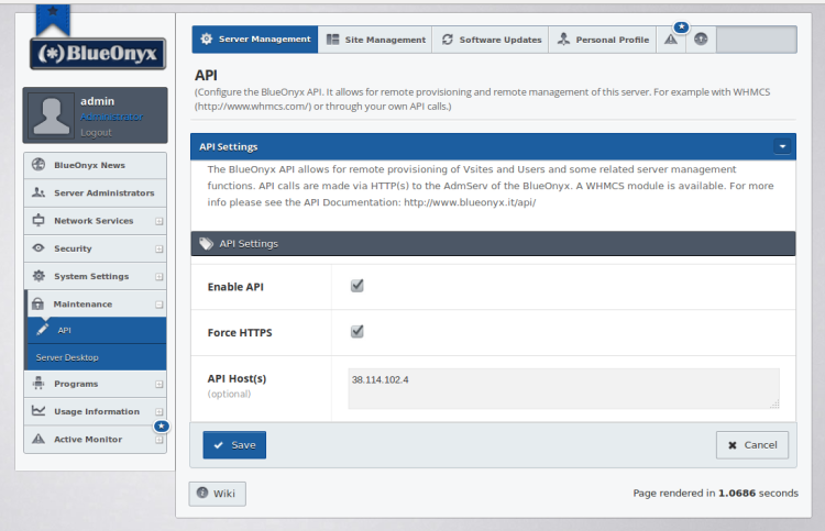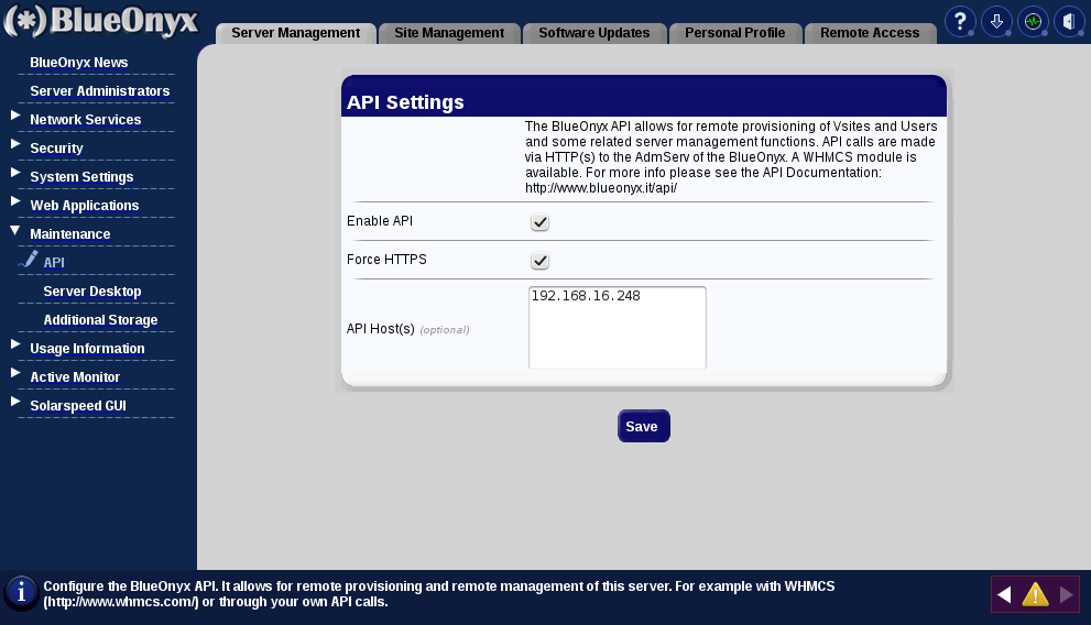 To enable the API login into the GUI of your BlueOnyx server and go to "Server Management" / "Maintenance" / "API":