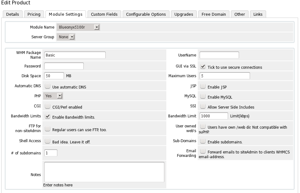 When you create a "Product" in WHMCS that uses a BlueOnyx server as backend, then you can configure various hosting packages which have different settings and features active. Below is a screenshot of the "Module Settings" of a sample "Basic" hosting package: