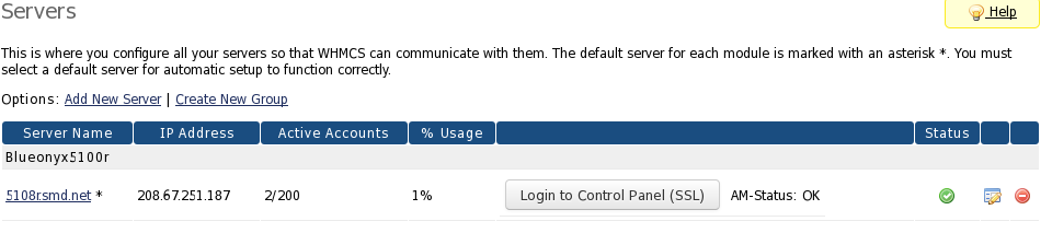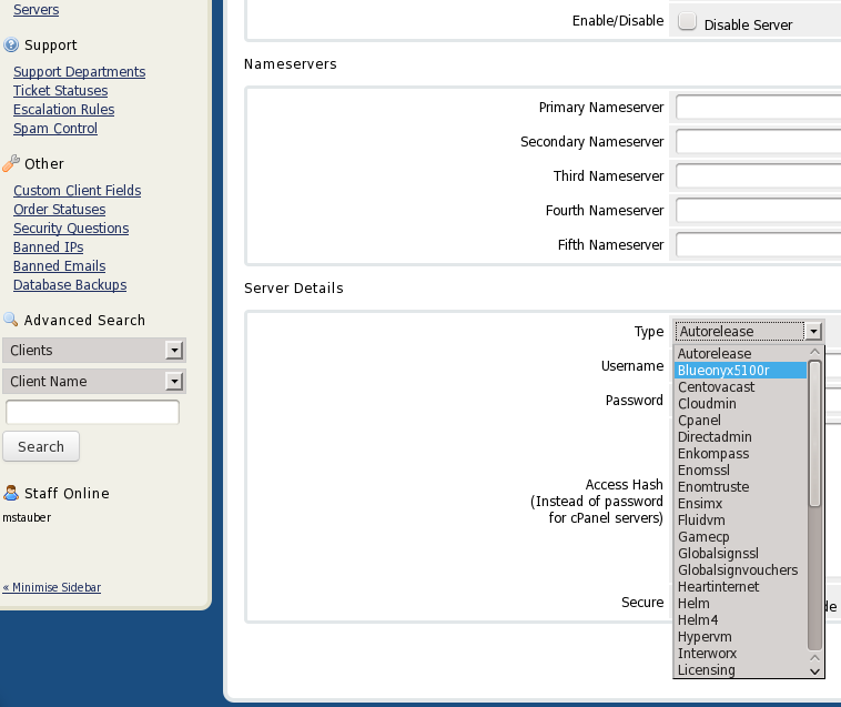 Once that module is installed, click on "Product/Services" in WHMCS and add a new server. In the "Type" pulldown you will see "Blueonyx5100r":