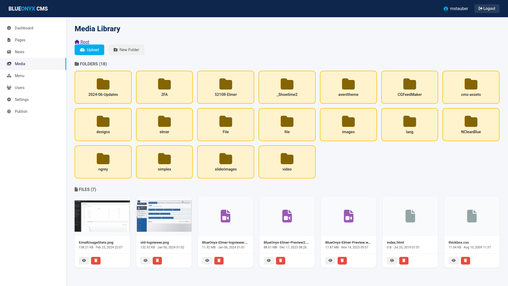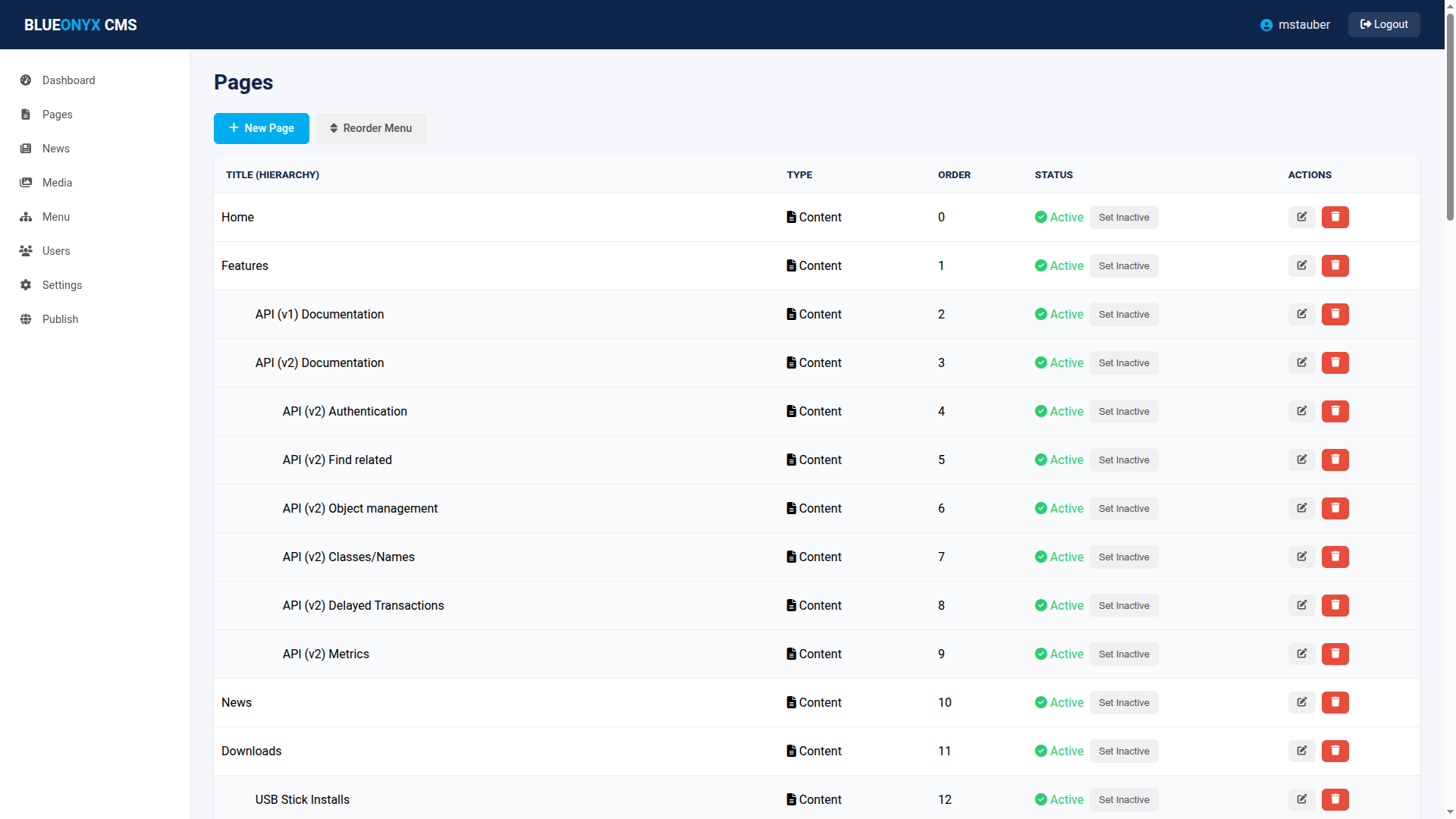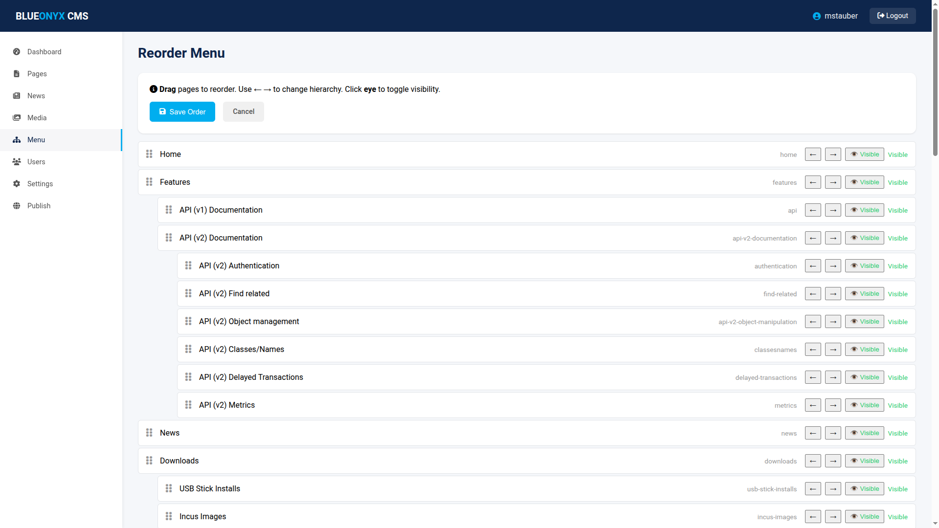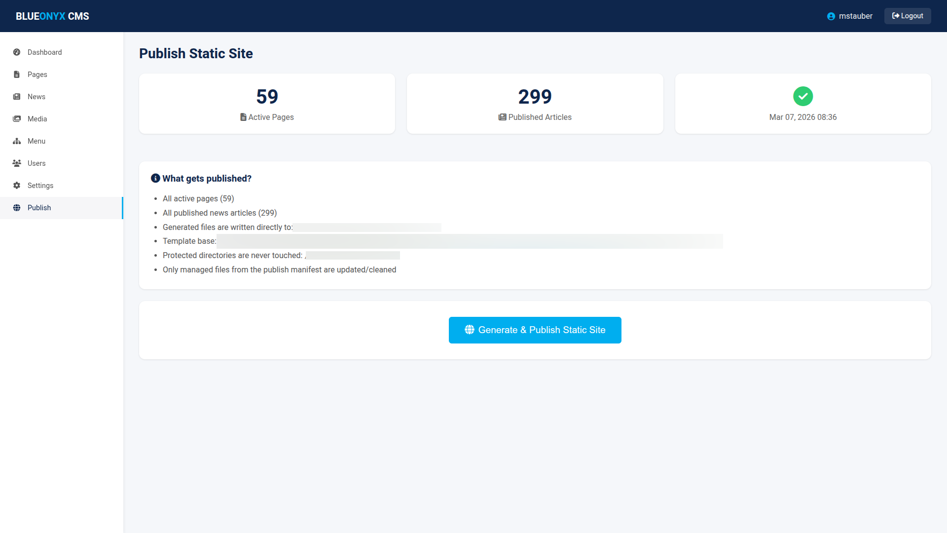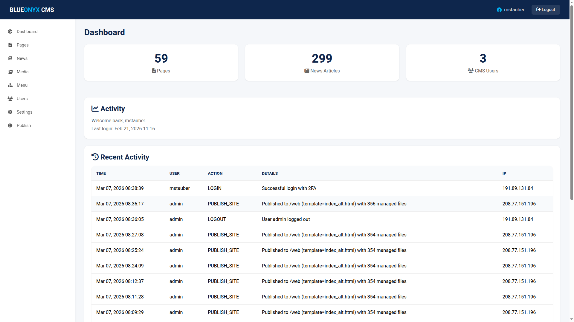 The backend is purpose-built for page/news/media/menu/publish workflows and avoids unnecessary public complexity.