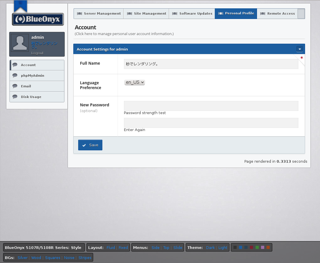 You'll also notice that this "Personal Profile" page shows the new way of how you can change your BlueOnyx theme. This element at the bottom of the page is only visible in "Personal Profile". The rest of the time it will be hidden.