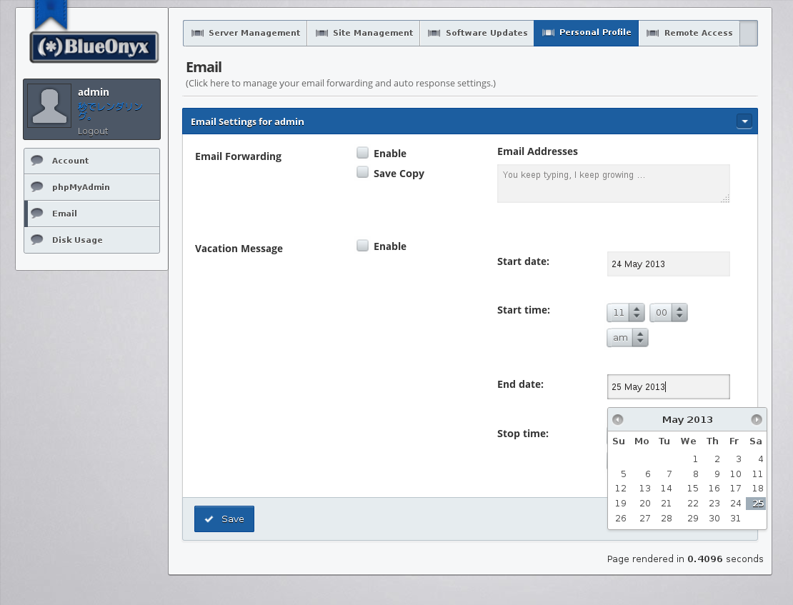 And yes: Although this page is in English, I specifically had saved a Japanese text into the field "Full Name". Keep in mind that Japanese data is stored in the CODB backend in the 'EUC-JP' encoding that it was received in. Therefore it usually is not compatible with the English GUI's 'UTF-8' settings. So normally (like on the old BlueOnyx) it would show up garbled.